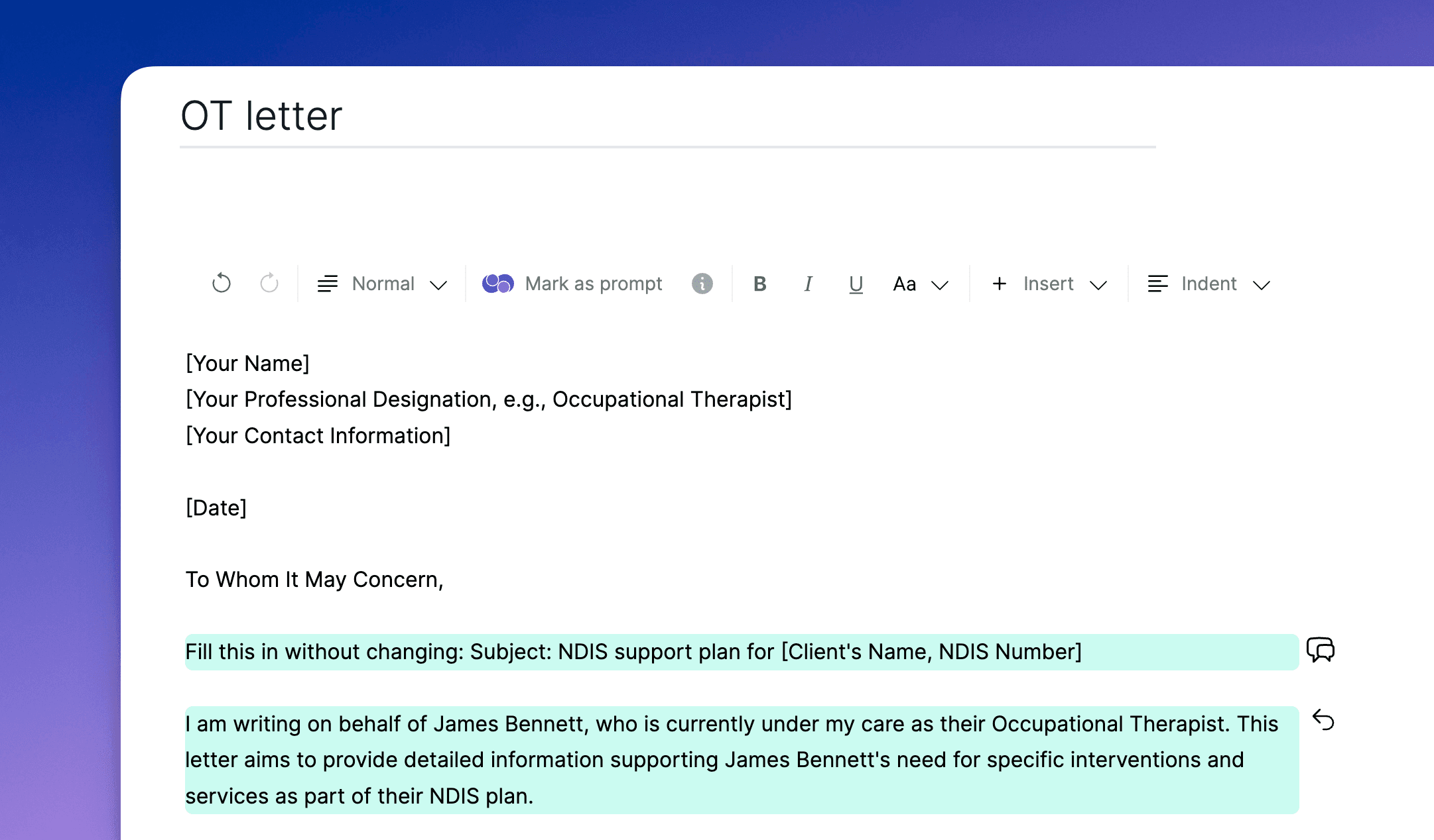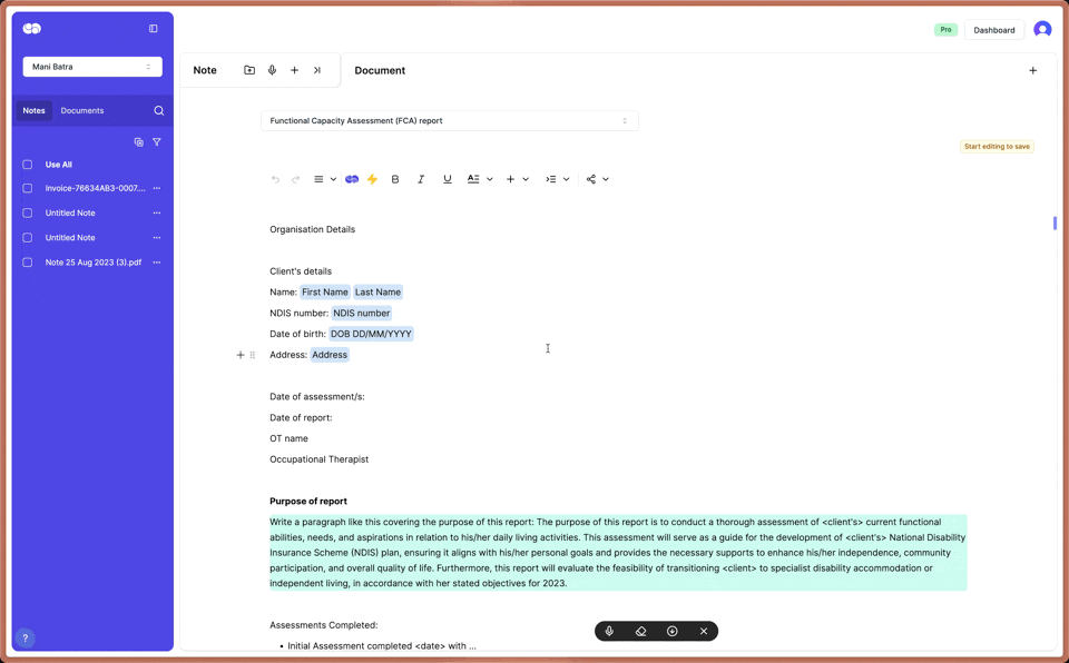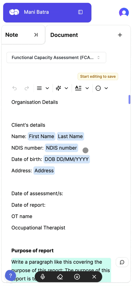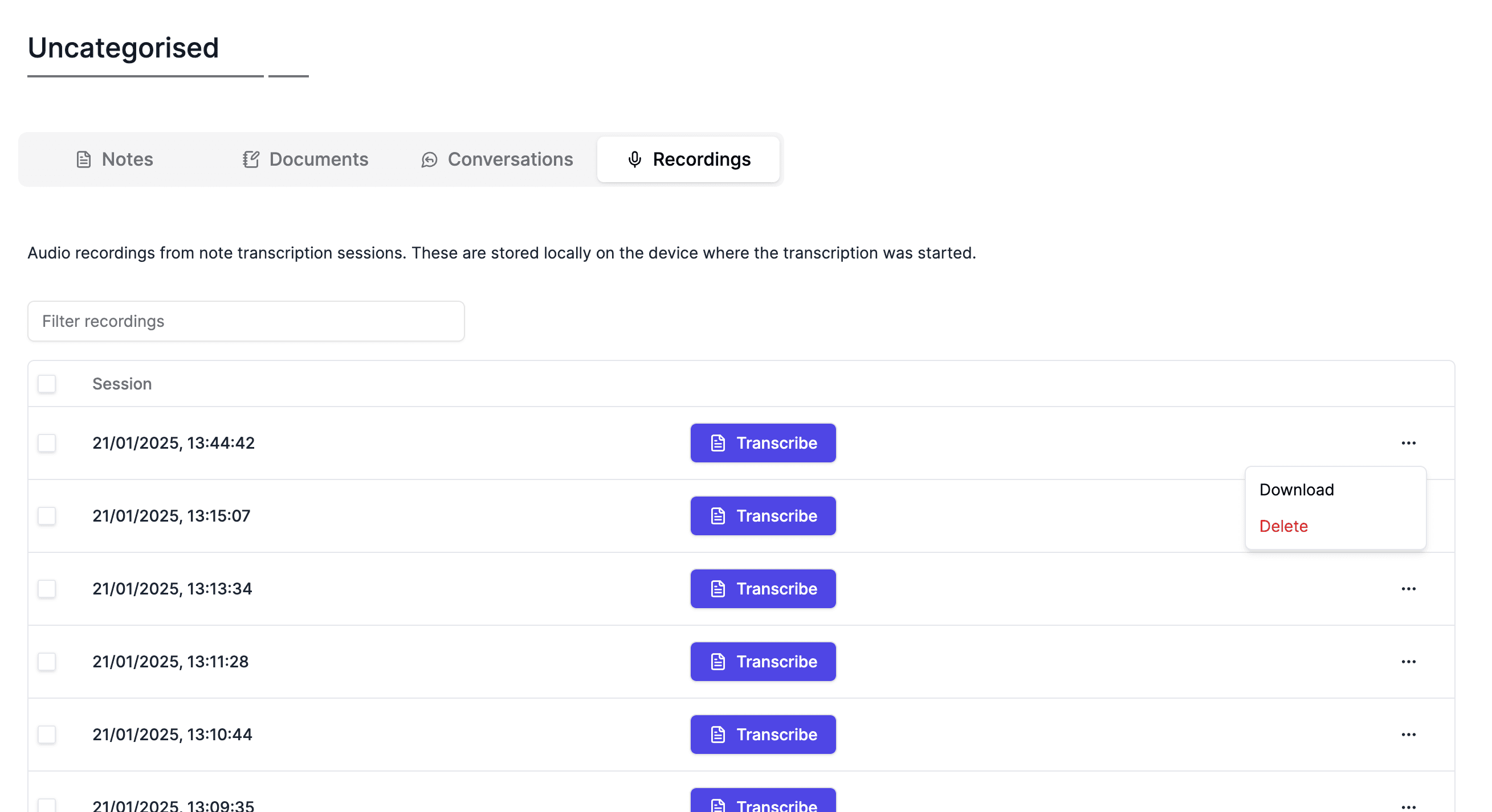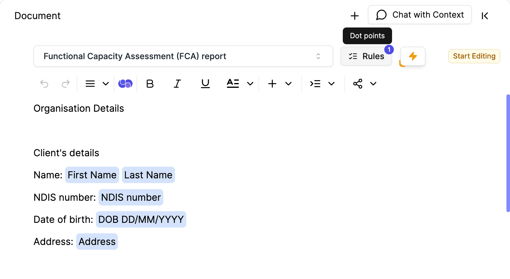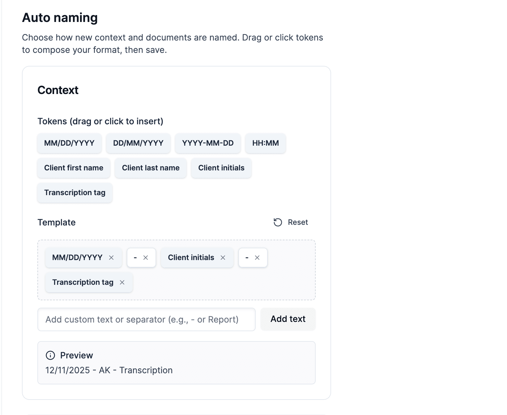 Set your own naming format once and we’ll name new context notes, live transcriptions, and documents for you automatically. This keeps titles consistent and saves time.